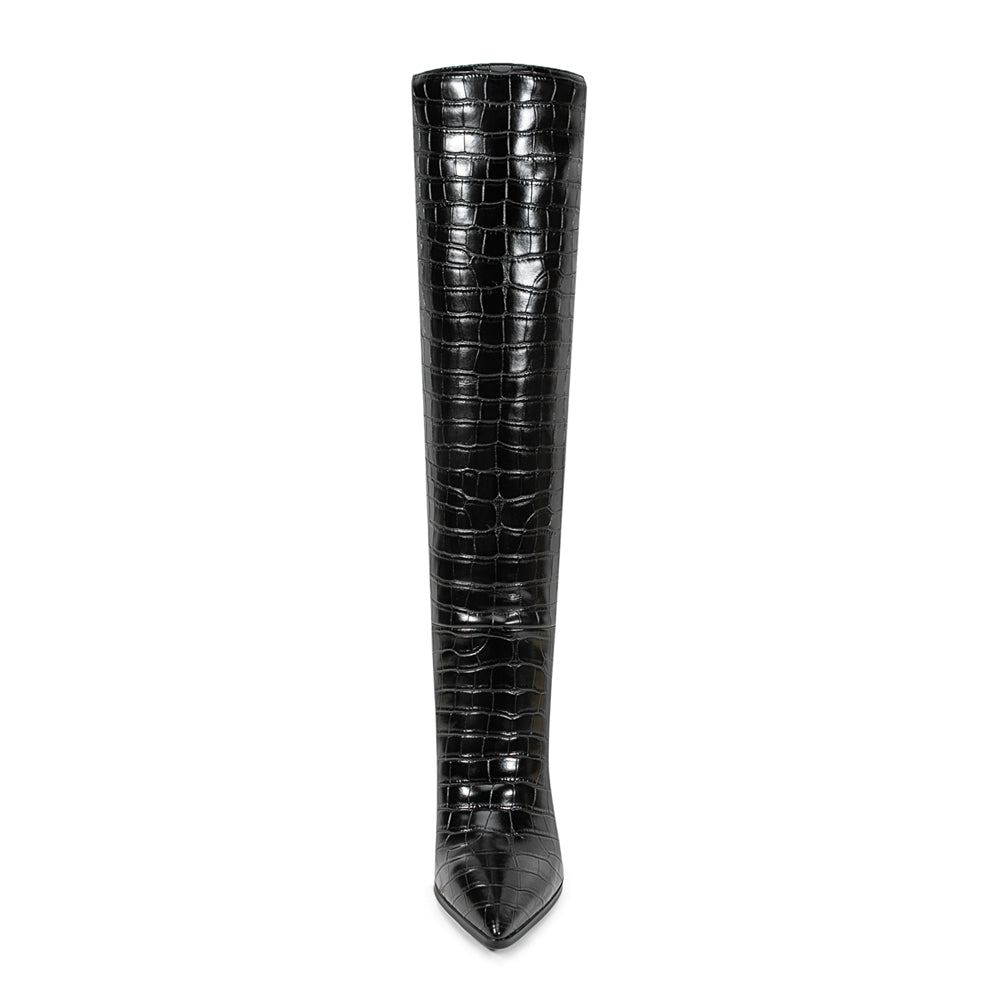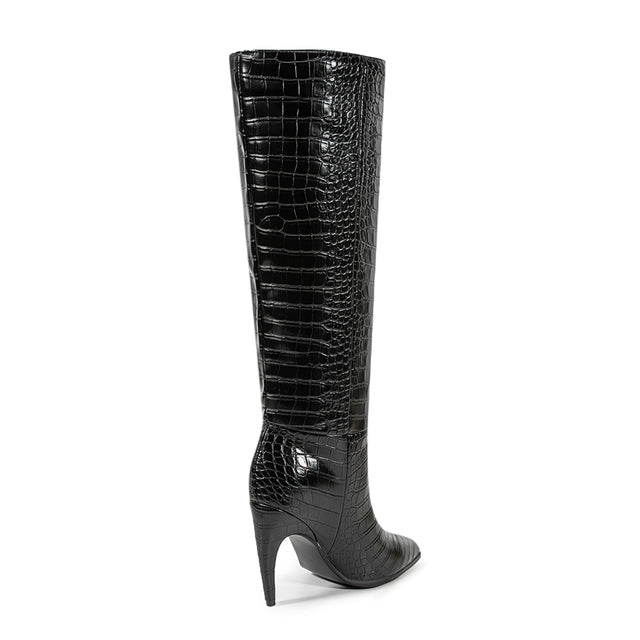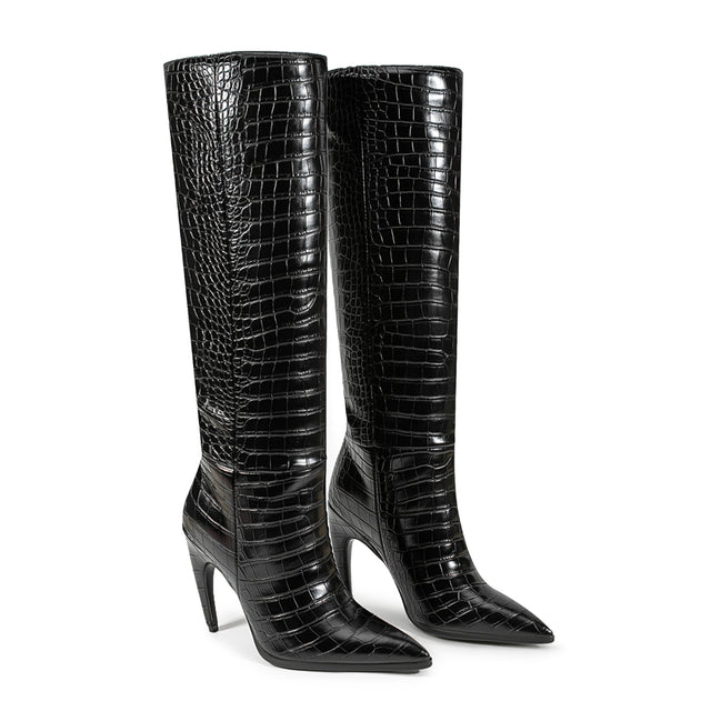 The Opulessa Auburnyx Event Boots are tall winter boots crafted from durable rubber, featuring a pointed toe design.