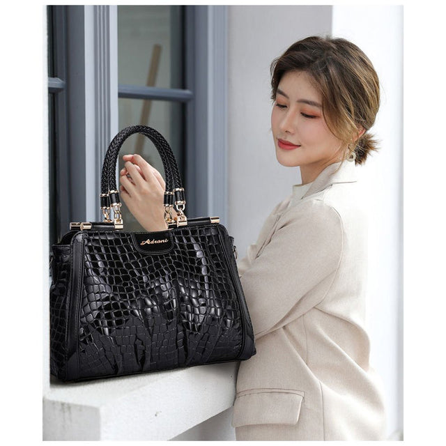 The Luxalon Business Carryall is crafted from genuine cow leather with a solid pattern, featuring a soft structure and a secure zipper closure, complemented by a single handle for easy carrying.