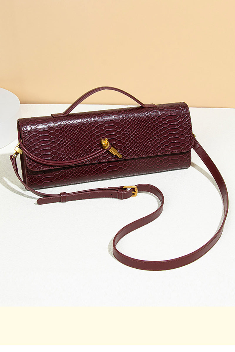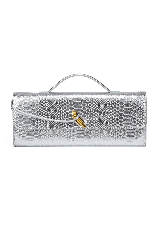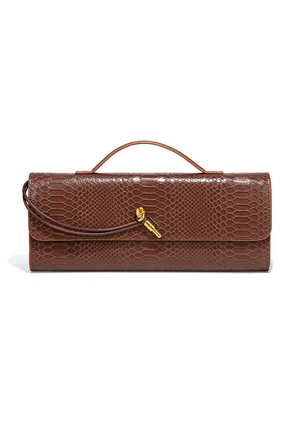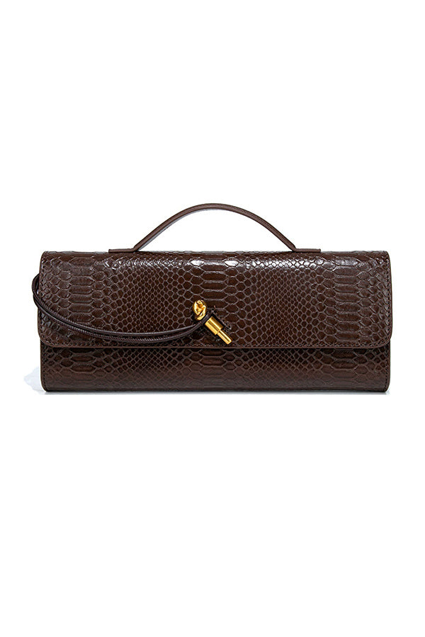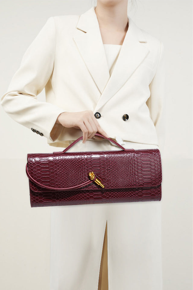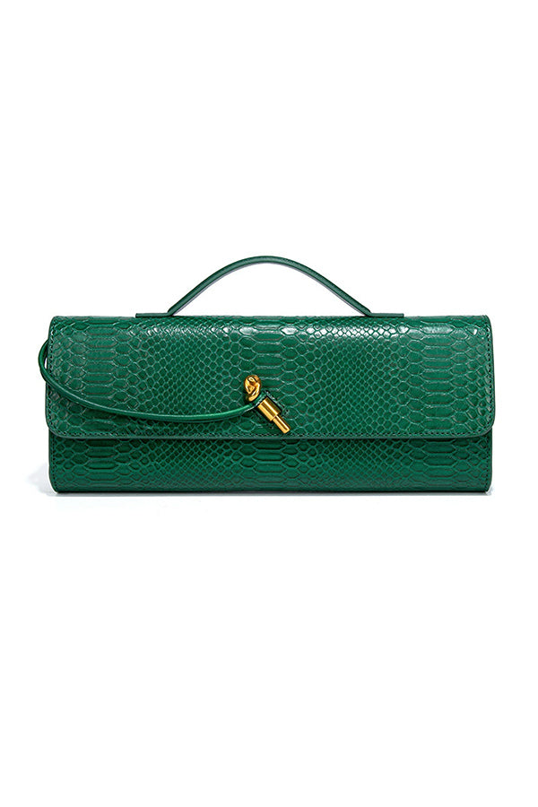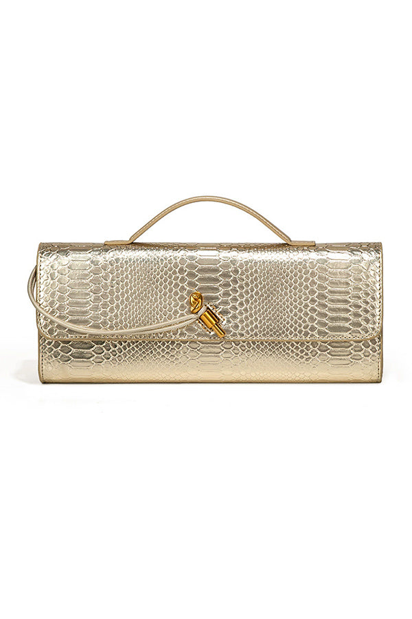 The Serpatura Snake Pattern Event Clutch Purse is crafted from soft PU material, featuring a solid pattern and a secure buckle closure, with an interior slot pocket for organization.