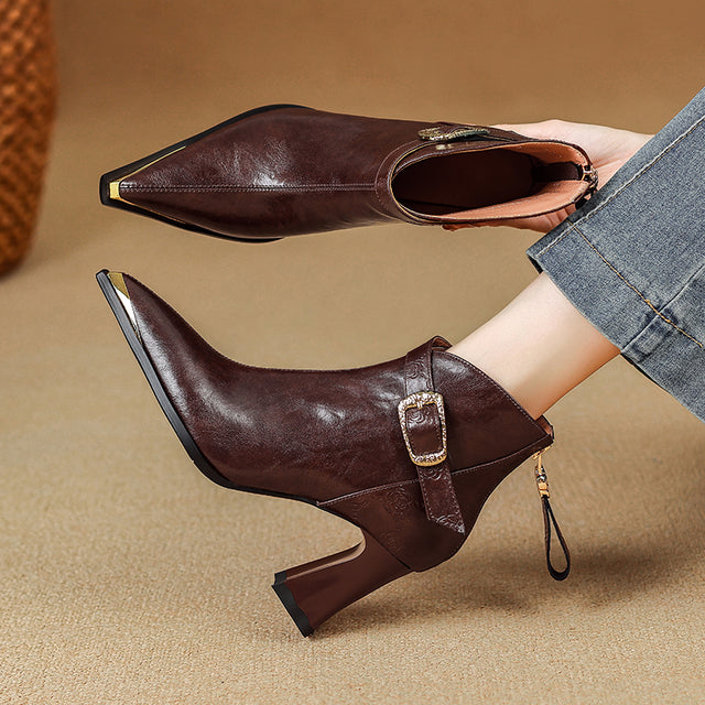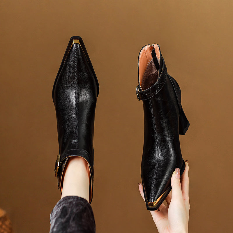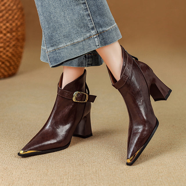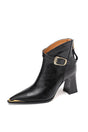 The Auburnyx Couture Event Boots feature a genuine cow leather upper and a short plush insole, designed with a high 3.15-inch thick heel and an ankle-high boot height, complemented by a square toe shape for a stylish and comfortable fit.
