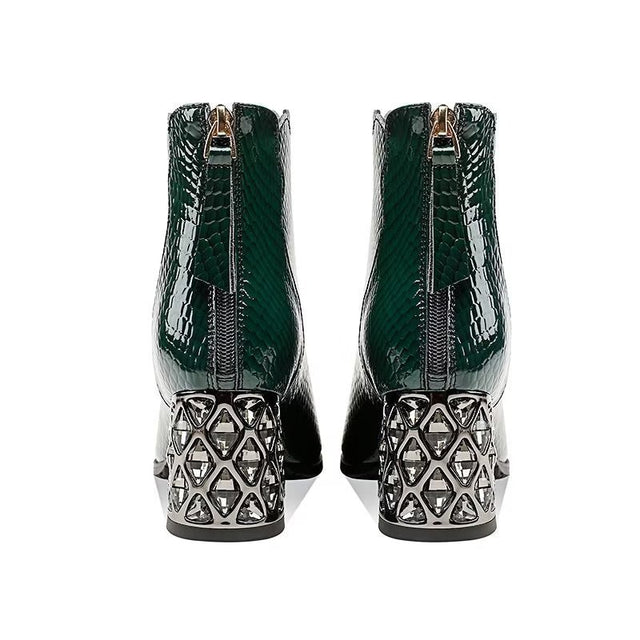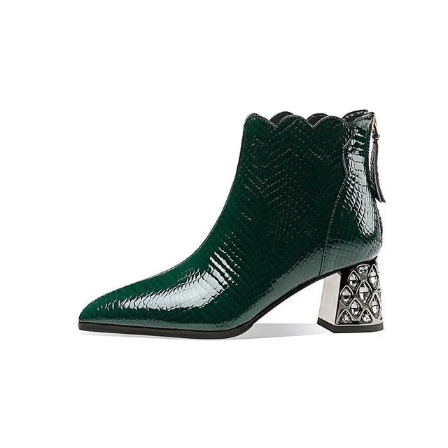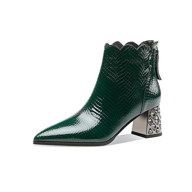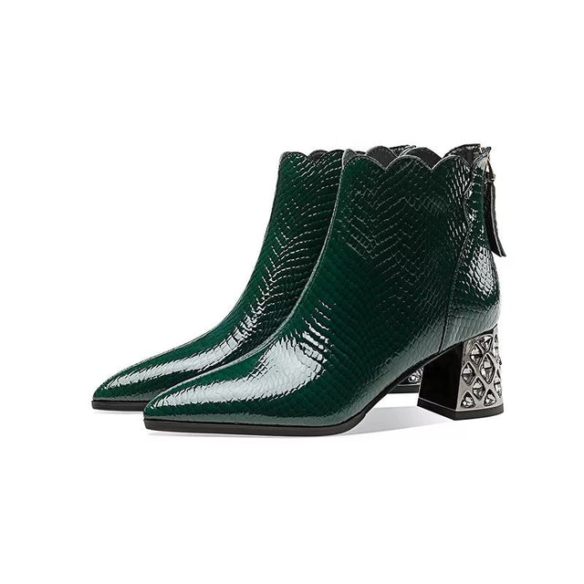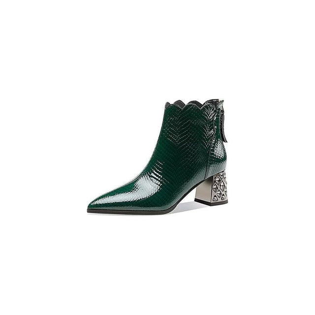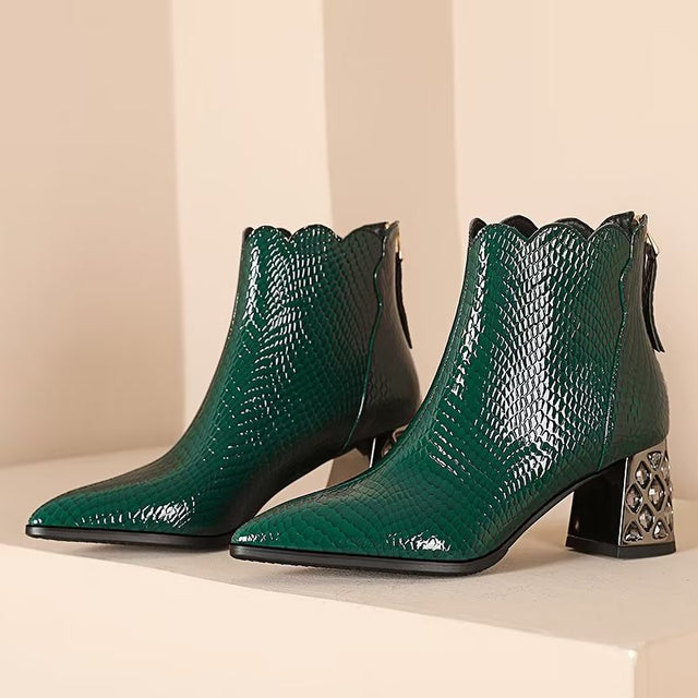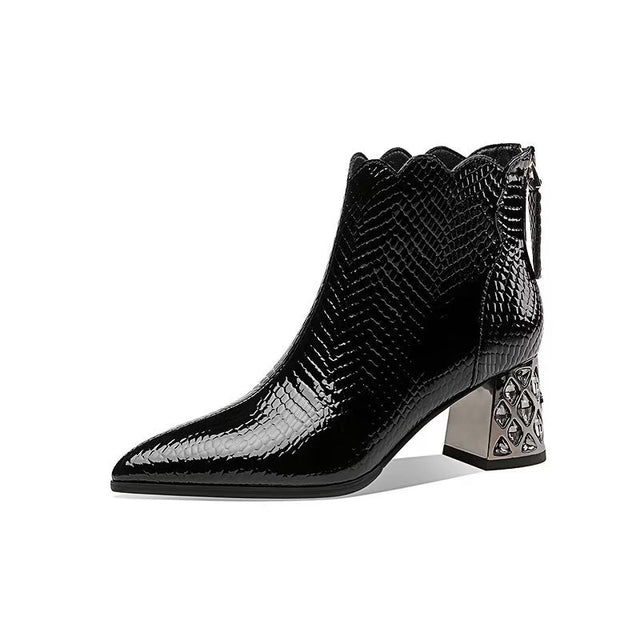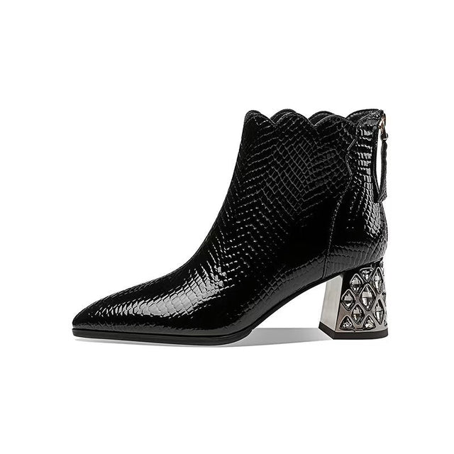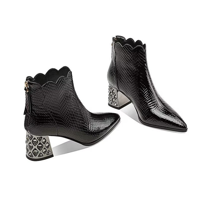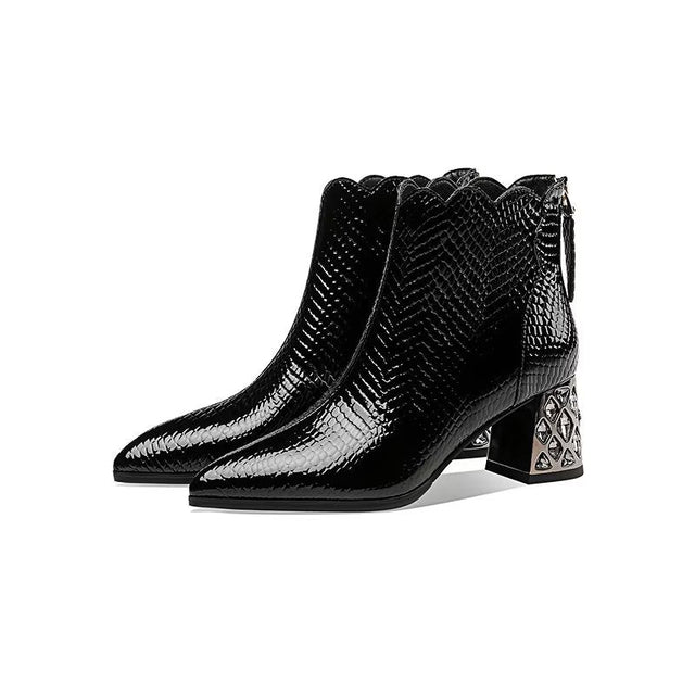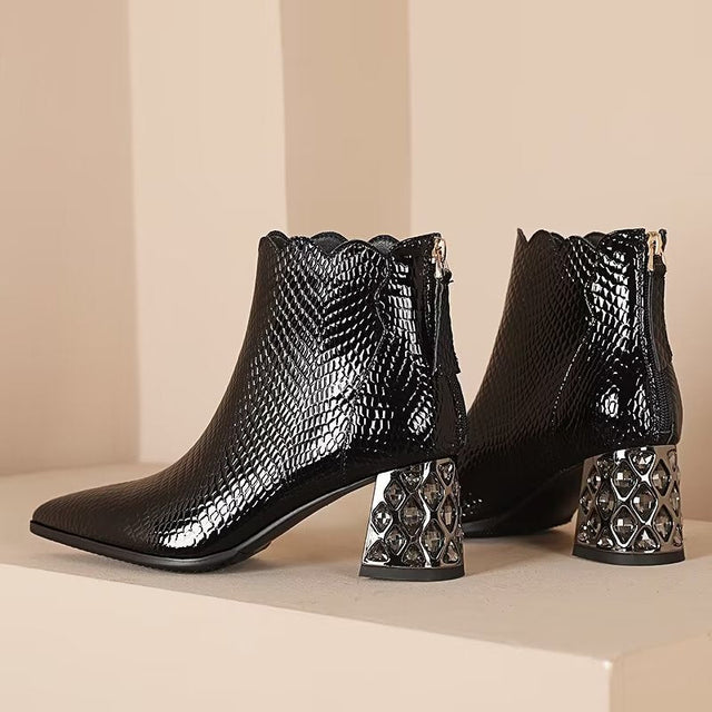 The Snakara Chromura Luxe Boots are crafted from genuine cow leather, featuring a pointed toe design and a middle-calf height. They include a full grain leather insole and are lined with short plush for added comfort.