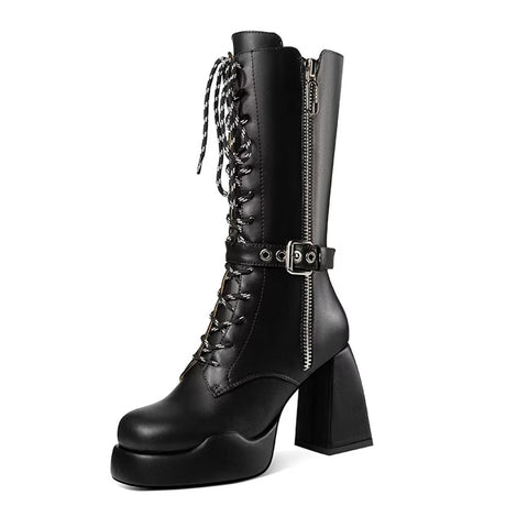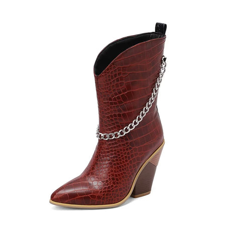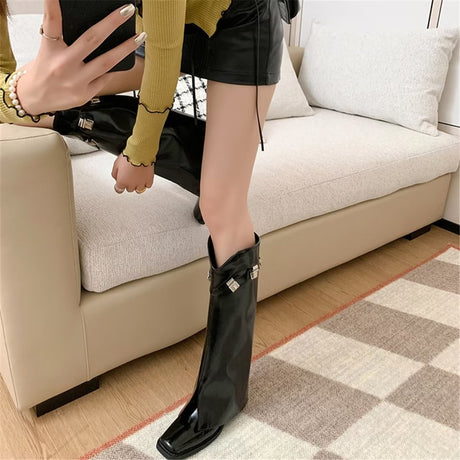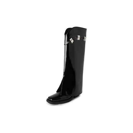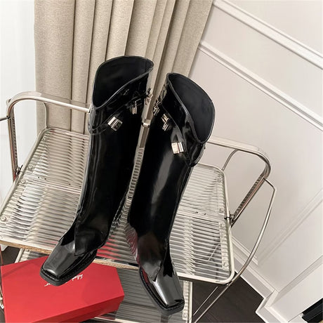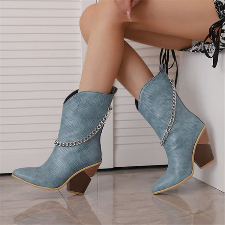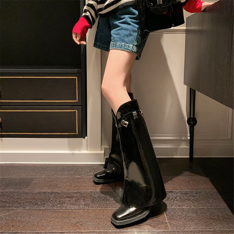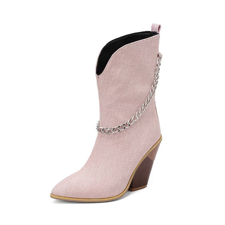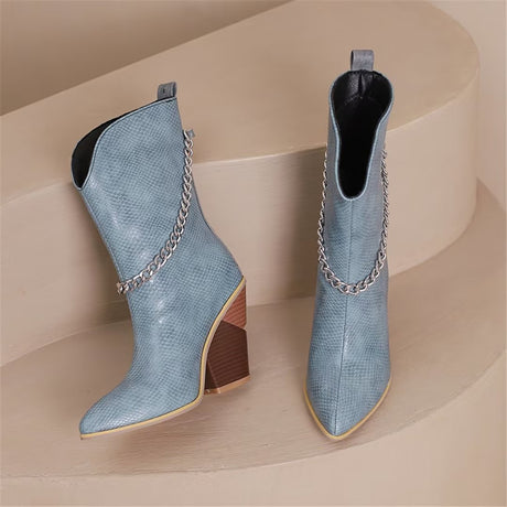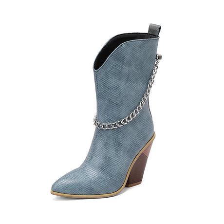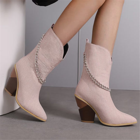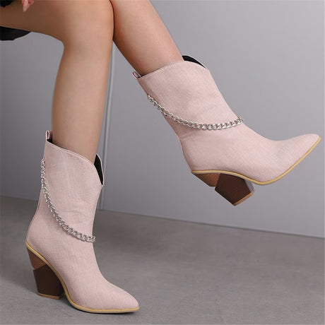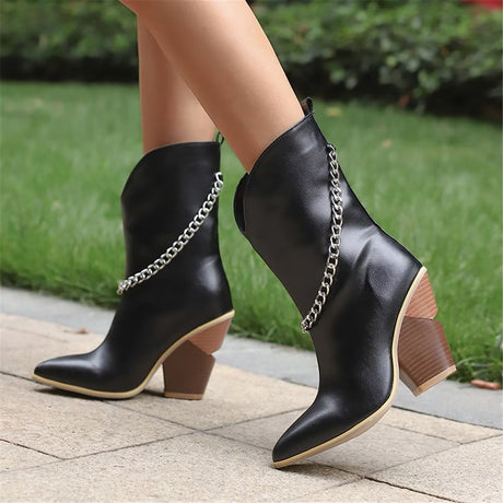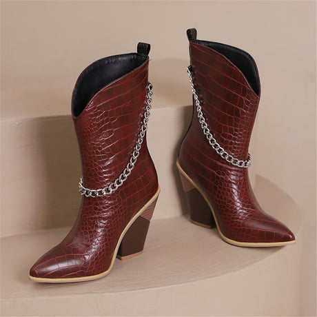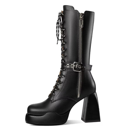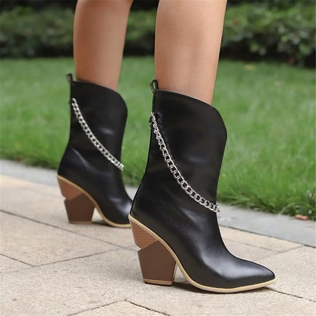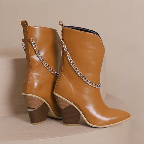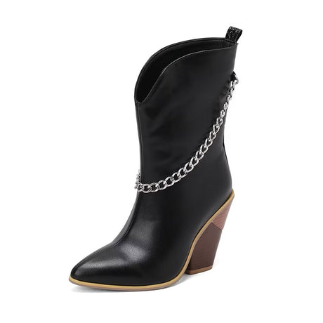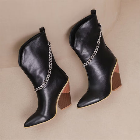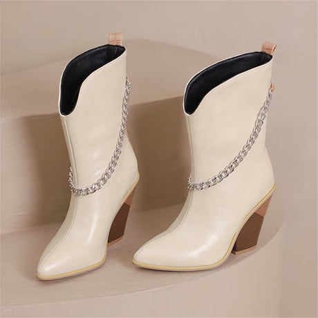 The Zephyrique Slip-On Elegance Boots are crafted with a PU exterior and plush lining, featuring a full grain leather insole for comfort. These mid-calf boots have a high square heel measuring approximately 2 to 3 inches, complemented by a subtle platform of up to 1 inch. Designed with a square toe and slip-on closure, they are ideal for winter wear, with a durable rubber outsole for traction.