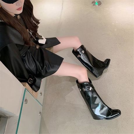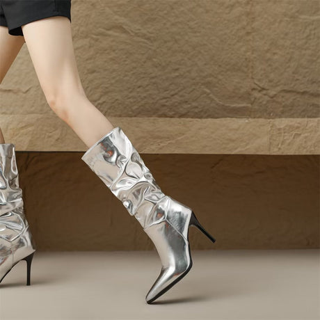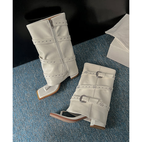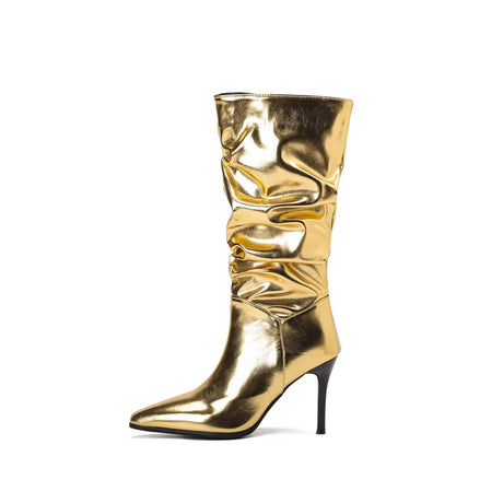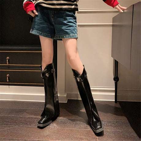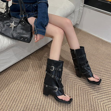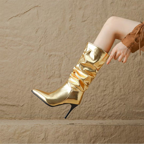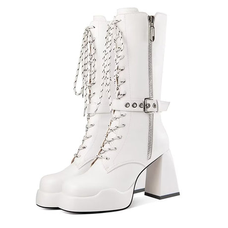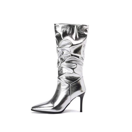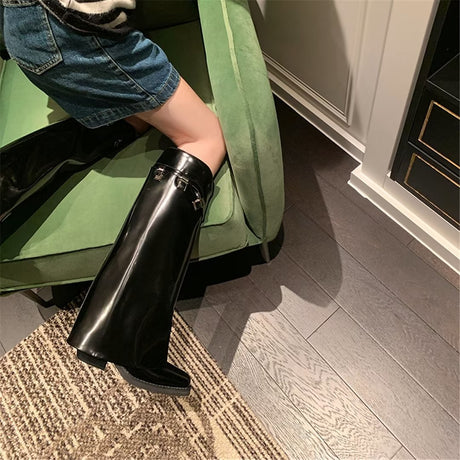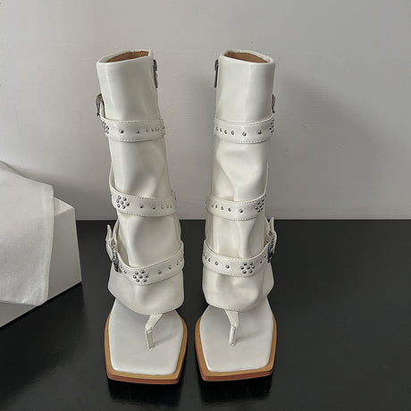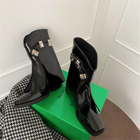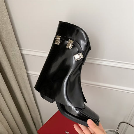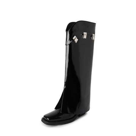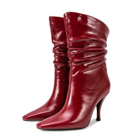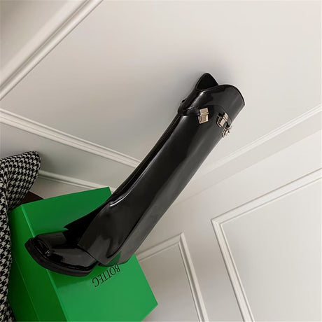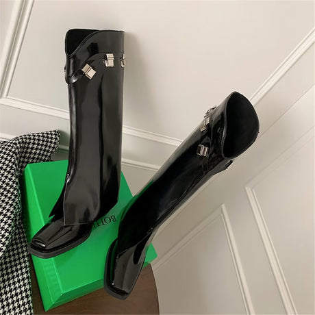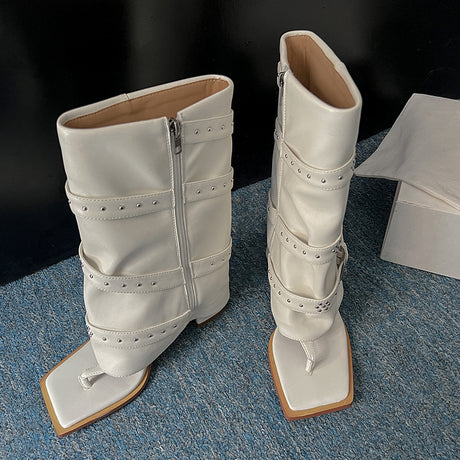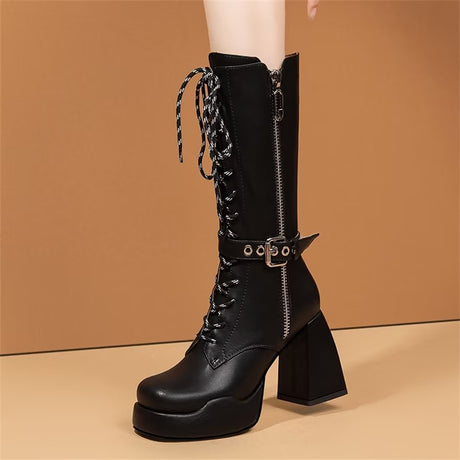 The Zephyrique Slip-On Elegance Boots are crafted with a PU exterior and plush lining, featuring a full grain leather insole for comfort. These mid-calf boots have a high square heel measuring approximately 2 to 3 inches, complemented by a subtle platform of up to 1 inch. Designed with a square toe and slip-on closure, they are ideal for winter wear, with a durable rubber outsole for traction.