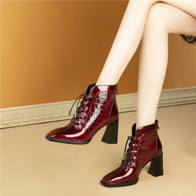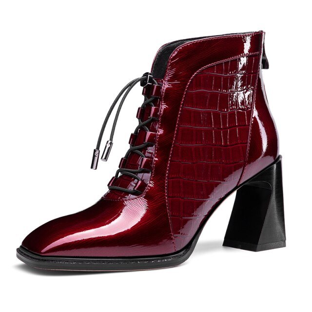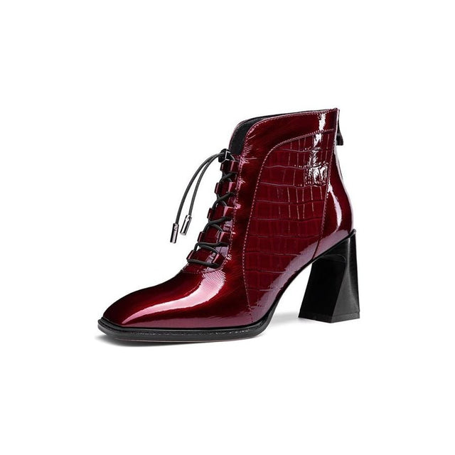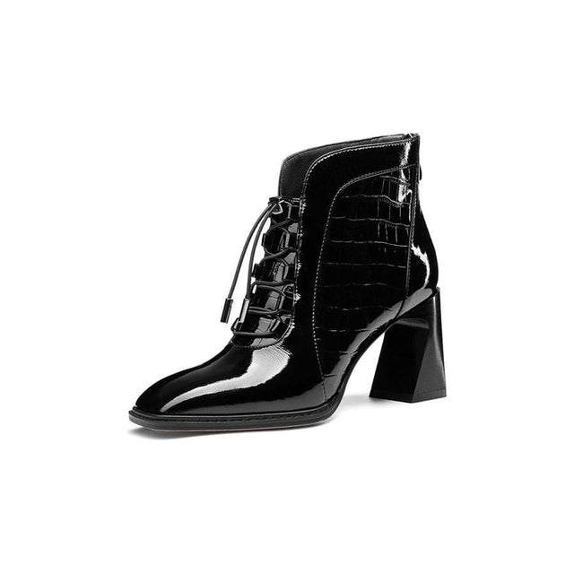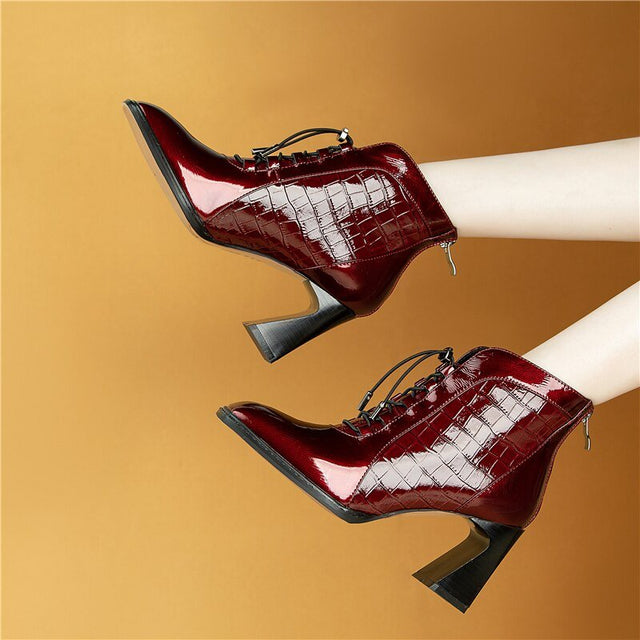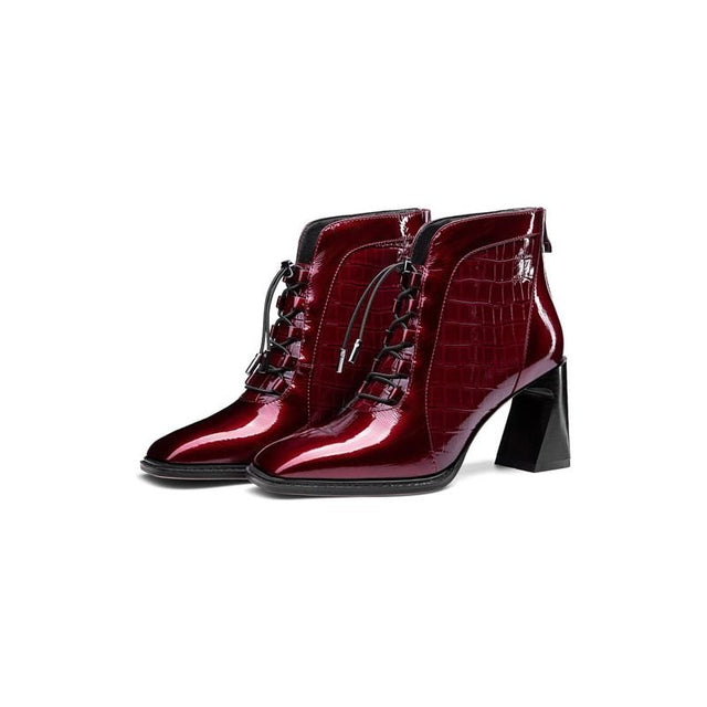 The Zephyrique Croctex Zippered Ankle Boots are crafted from genuine cow leather, featuring a solid pattern and a high heel ranging from approximately 2 to 3 inches. These ankle-height boots have a pointed toe design and a convenient zipper closure.