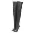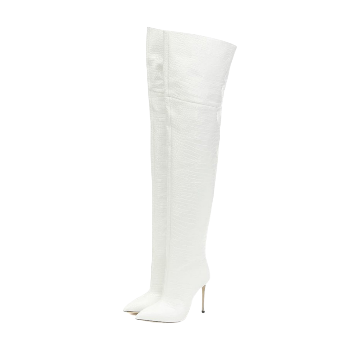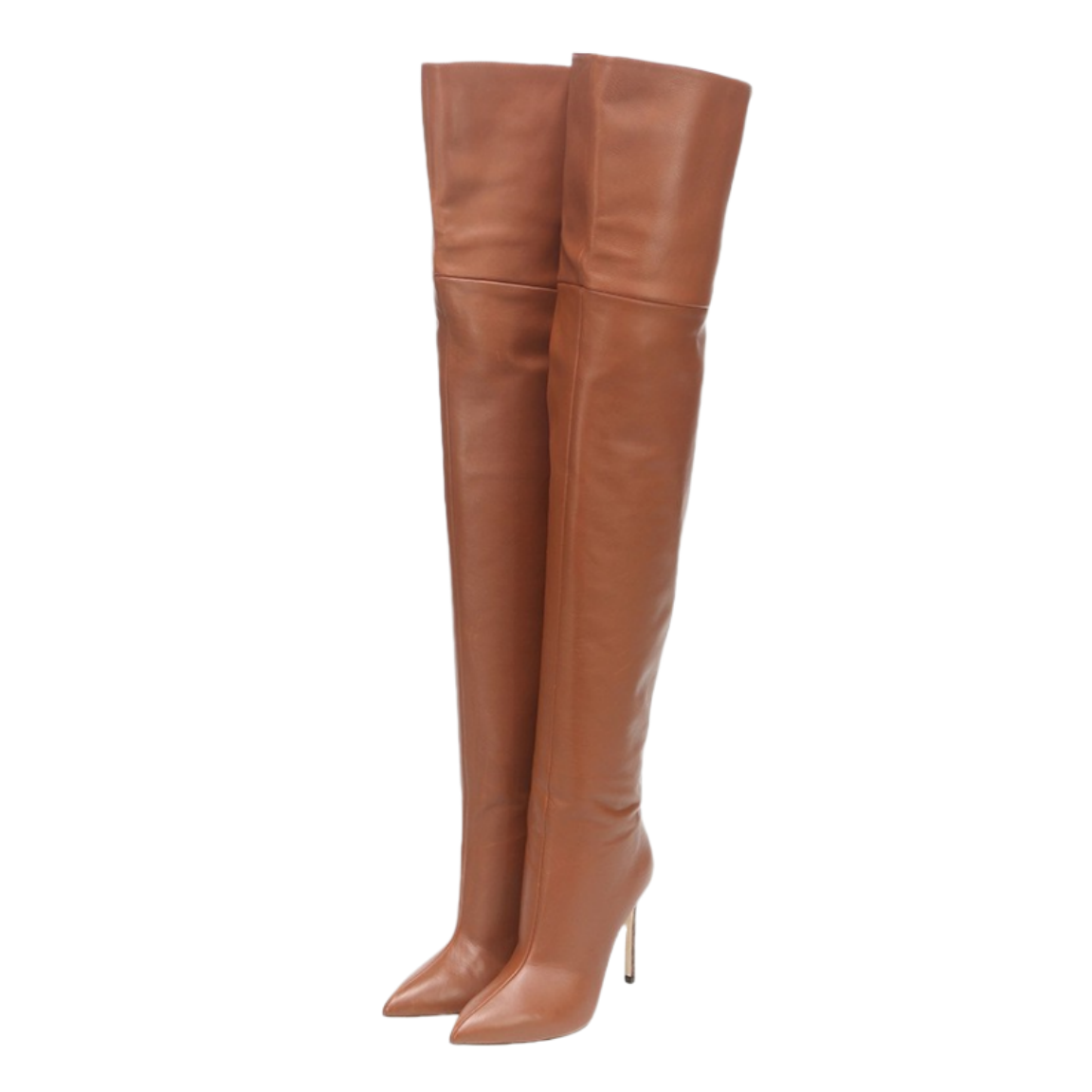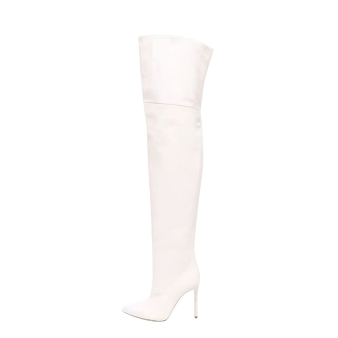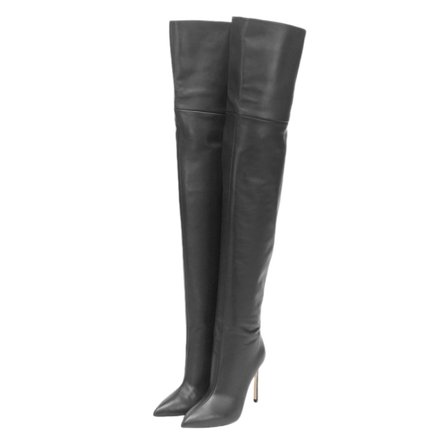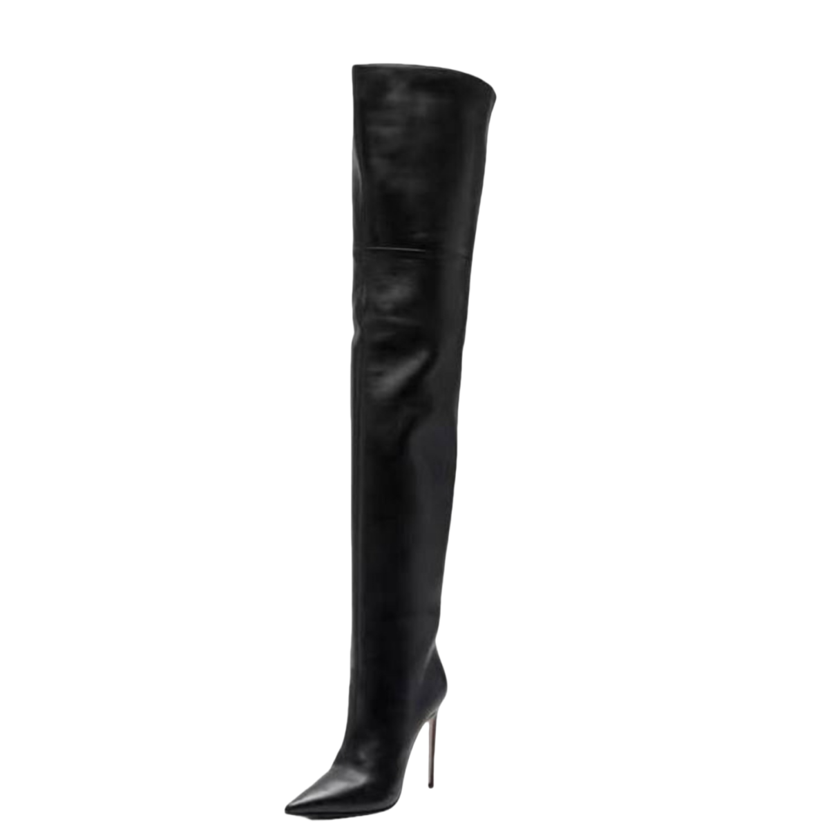 The Veltique Effortless Chic Boots are knee-high fashion boots made from solid-patterned PU material, featuring a slip-on closure and a pointed toe design. They have thin heels with a height of approximately 4.7 inches.