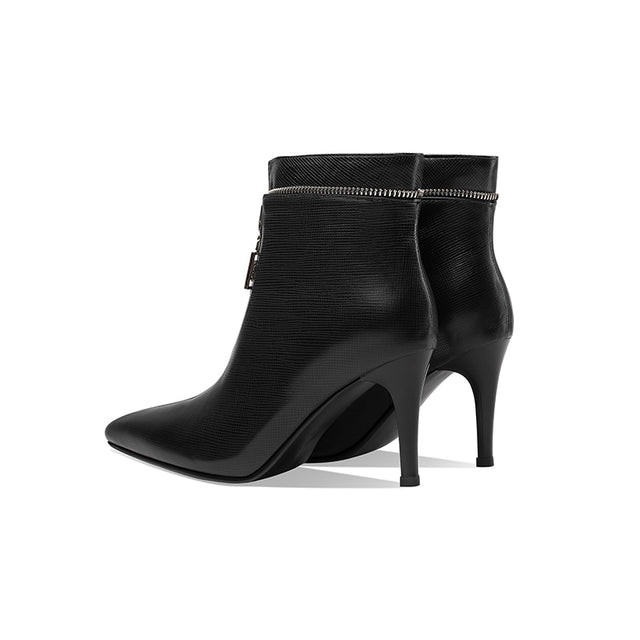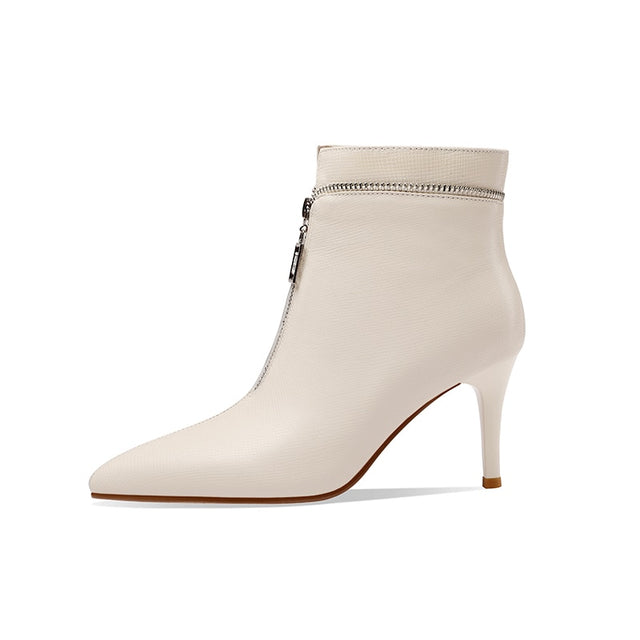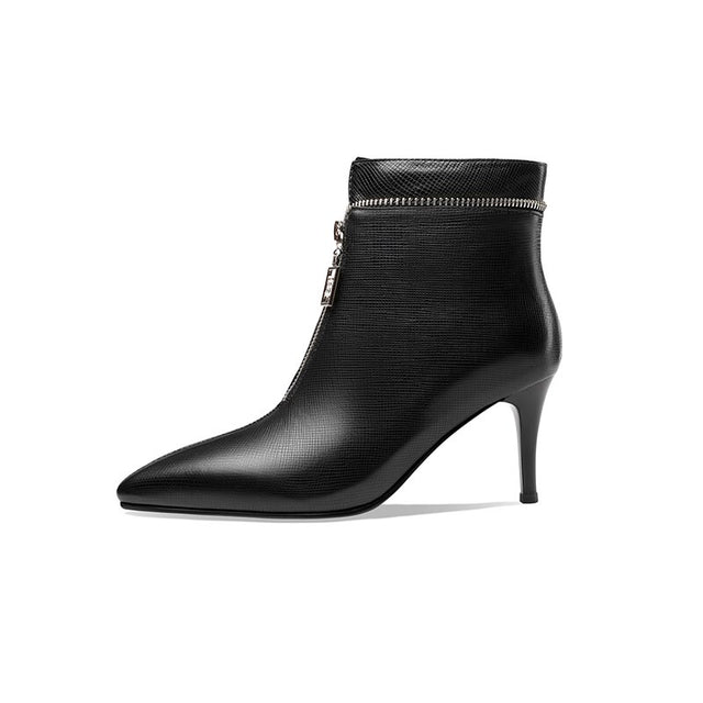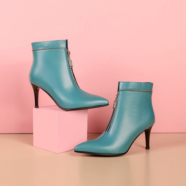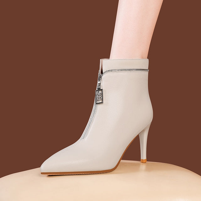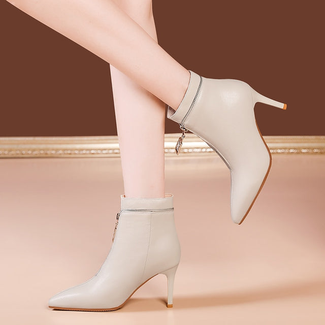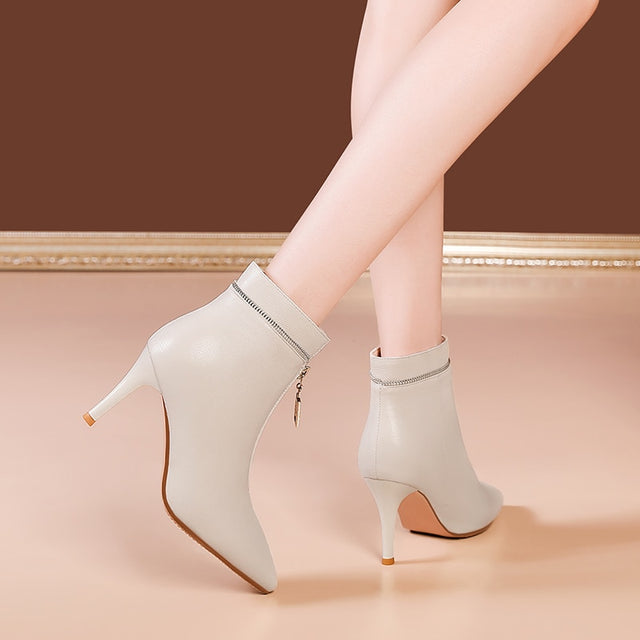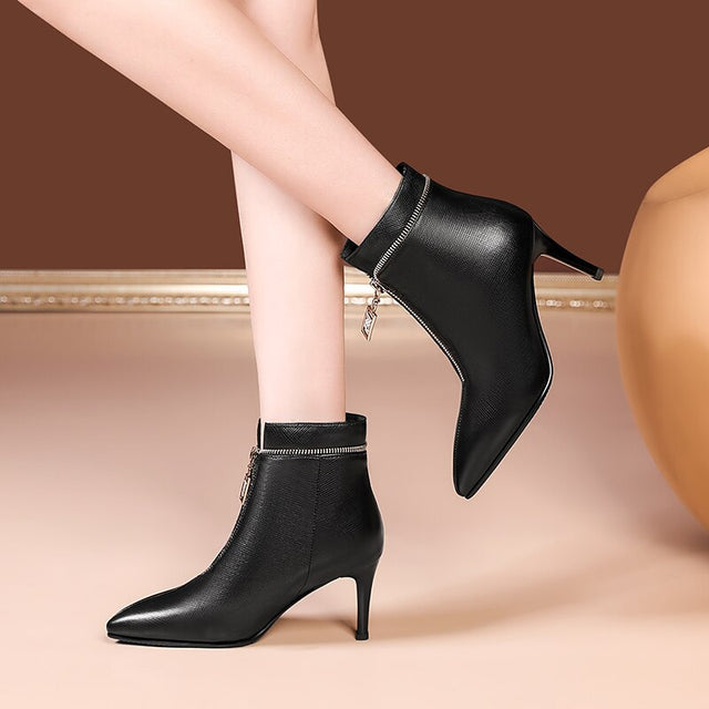 The Serpatura Silhouettes Ankle Boots are crafted from genuine cow leather, featuring a solid pattern and a high heel ranging from 2 to 3 inches. These boots have a pointed toe design and a convenient zipper closure, with the boot height reaching the ankle.