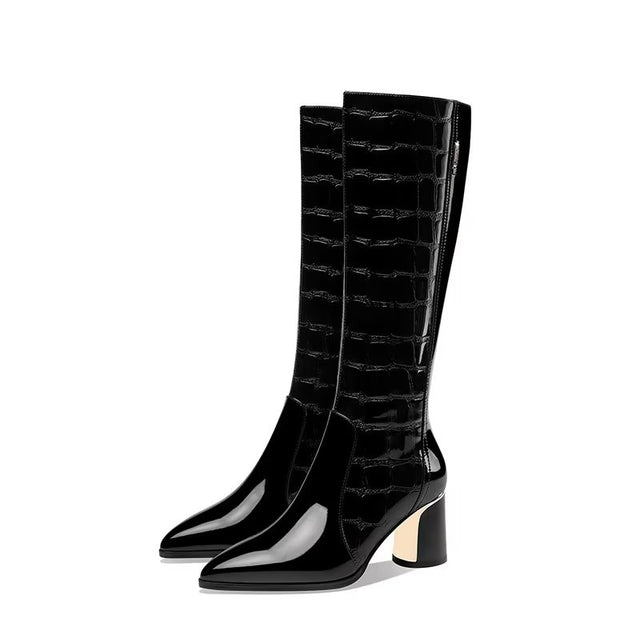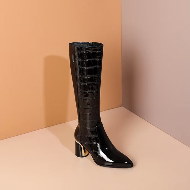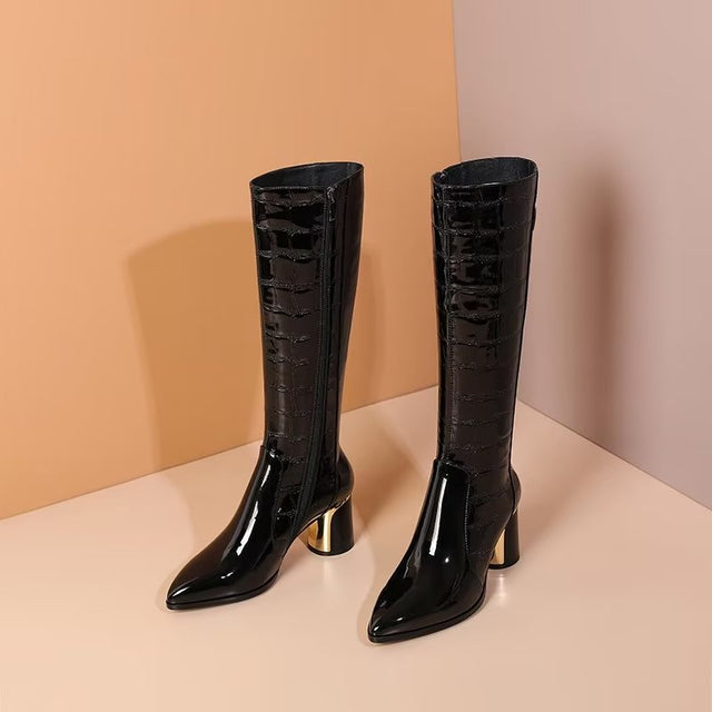 The Luxalon Serpatura High Boots are crafted from genuine cow leather, featuring a knee-high design with a slip-on closure and a pointed toe shape.