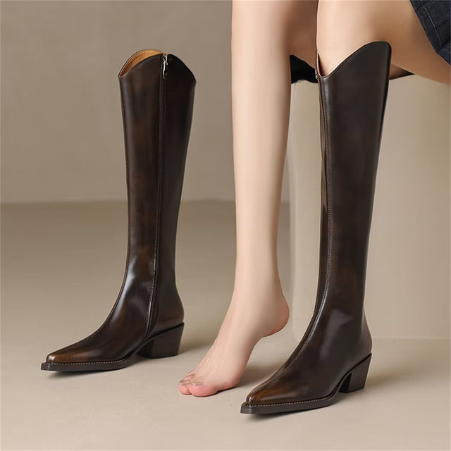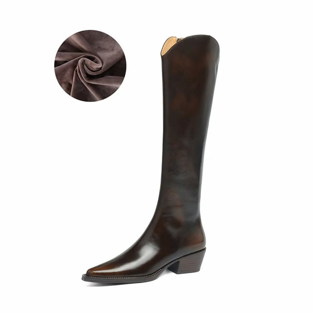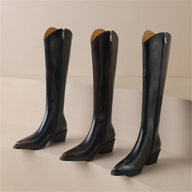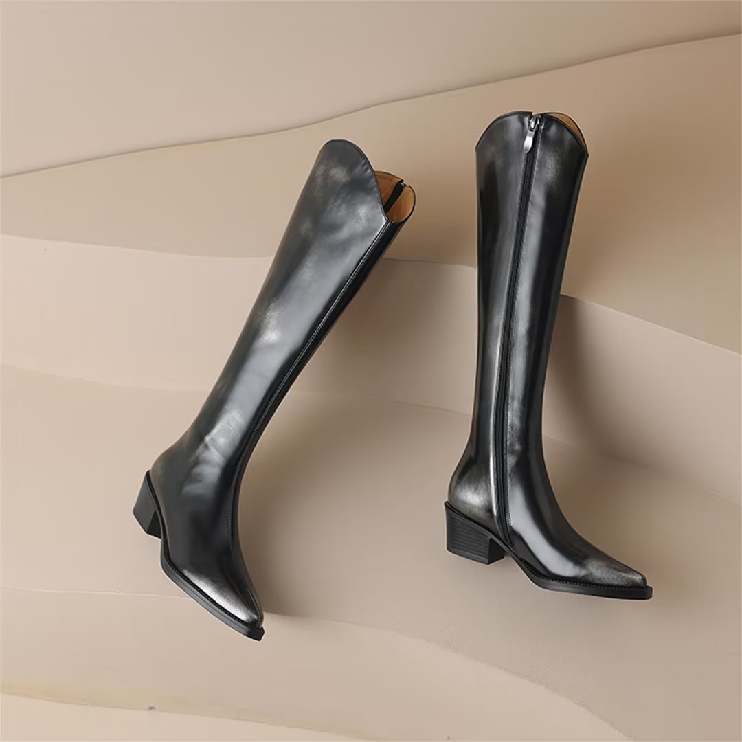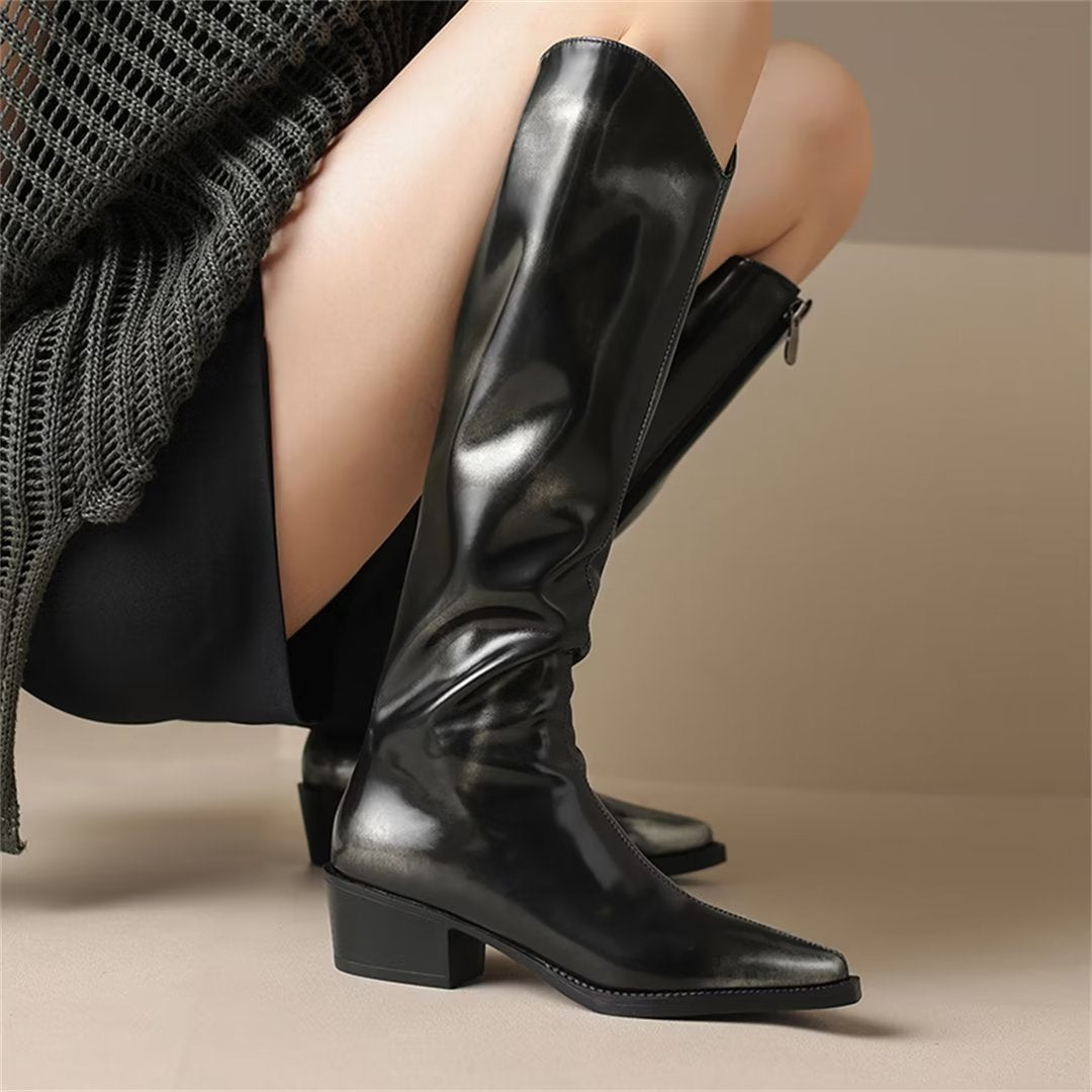 The Auburnyx Luxe Tall Boots are crafted from genuine cow leather, featuring a pointed toe and a convenient zip closure, with a heel height of approximately 1.77 inches and a durable rubber outsole.