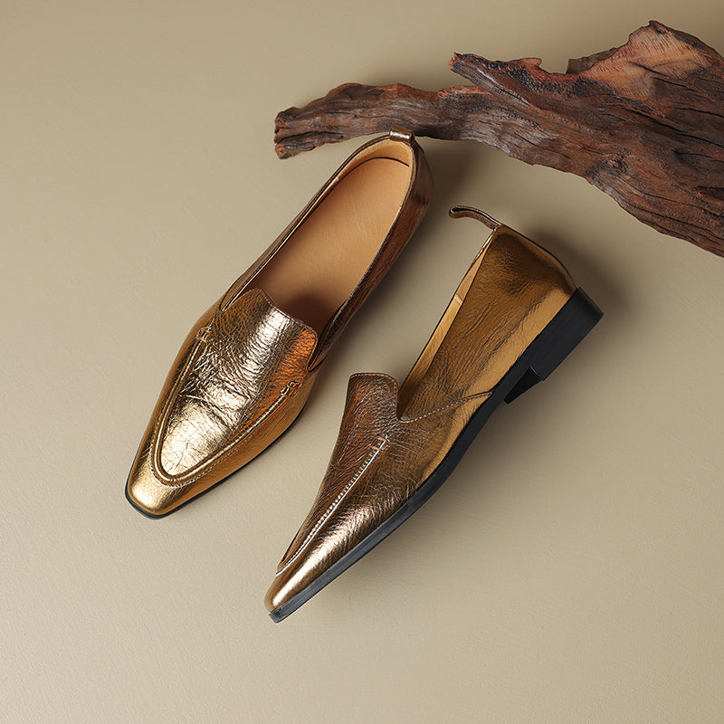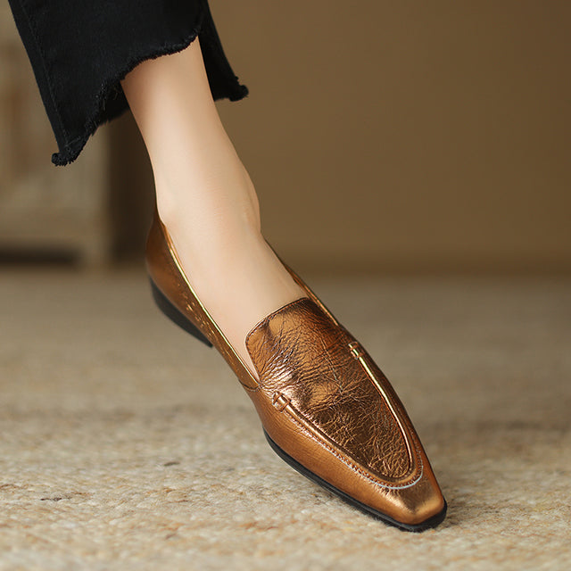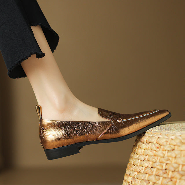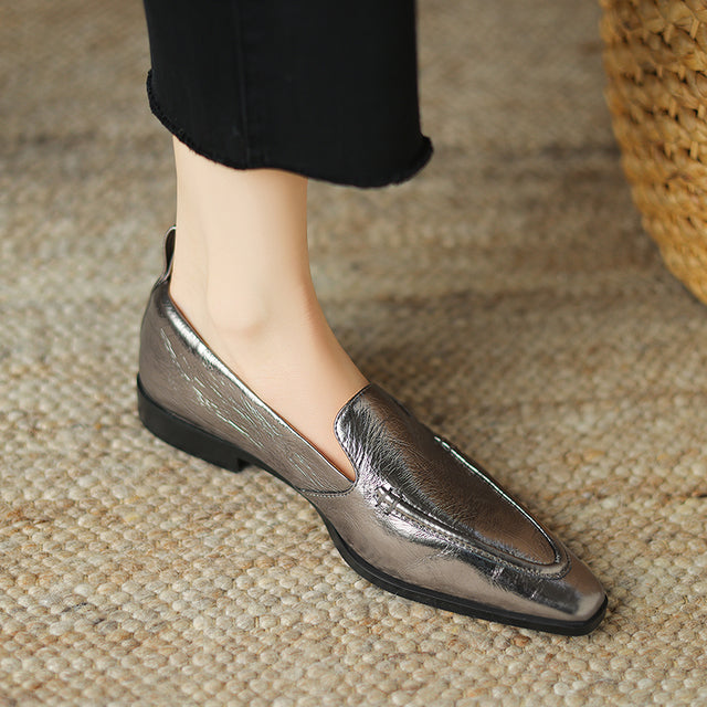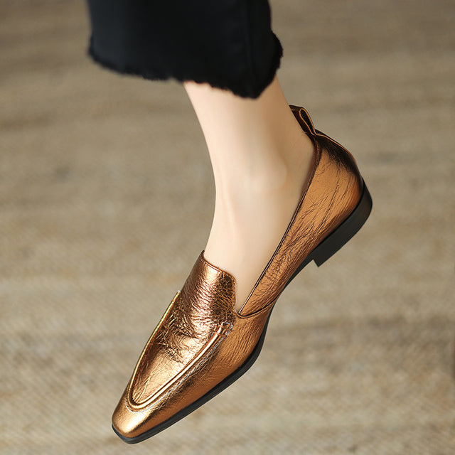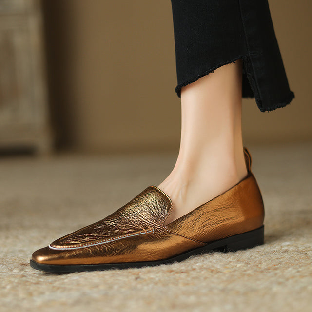 The Veltique Everyday Slip-Ons are flat loafers crafted from genuine cow leather, featuring a distinctive square toe design.