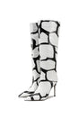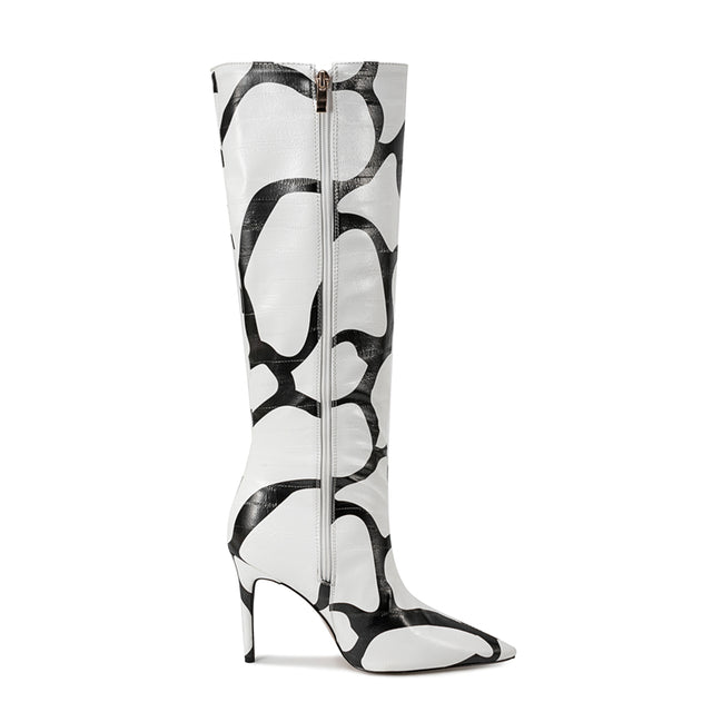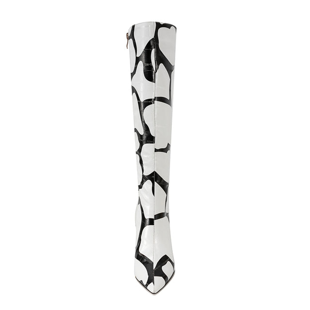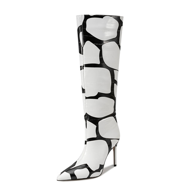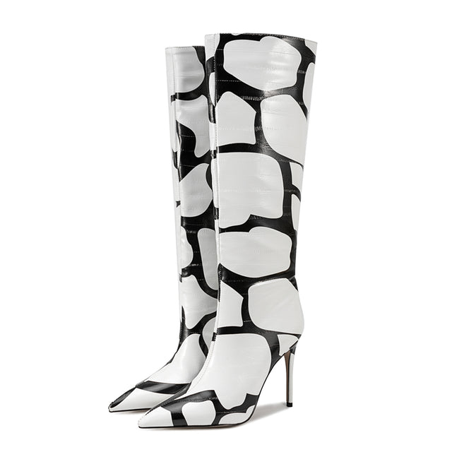 The Viprano Luxalon Prestige Knee Highs are tall winter boots crafted from solid leather, featuring a pointed toe design and a durable rubber outsole. They have a convenient zipper closure for easy wear.