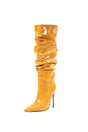 The Veltique Elegance Fashion Boots are knee-high, handmade boots crafted from solid PU material, featuring a high heel ranging from approximately 2 to 3 inches and a platform height of up to 1 inch. These boots have a slip-on closure and a pointed toe design.