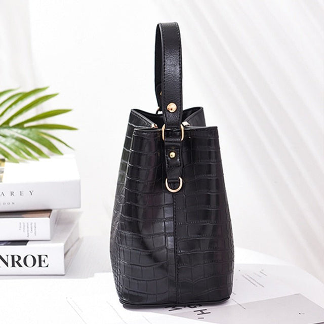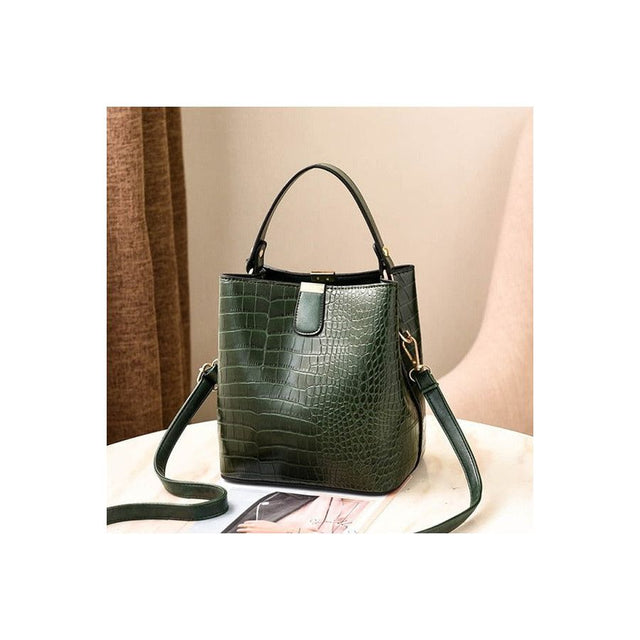 The Serpatura Chromura Tote is crafted from durable PU material with a bucket shape and features a secure hasp closure, complemented by a polyester lining for added durability.