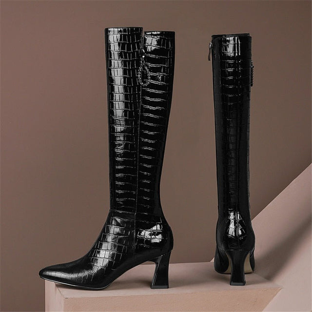 The Veltique Luxe High-Zip Boots are crafted from genuine cow leather with a solid pattern, featuring a knee-high design and a high heel ranging from approximately 2 to 3 inches. They have a pointed toe and a convenient zip closure, fitting true to size with a platform height of up to 1 inch.