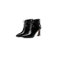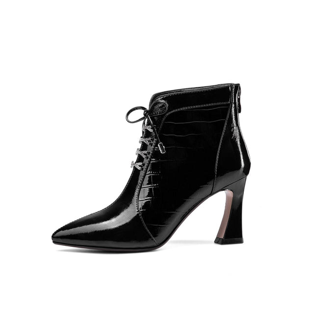The Serpatura Luxe Event Booties are crafted from genuine cow leather with a solid pattern, featuring a high heel ranging from approximately 2 to 3 inches. These ankle-height boots have a pointed toe design and a convenient zipper closure, with a short plush lining for added comfort.
