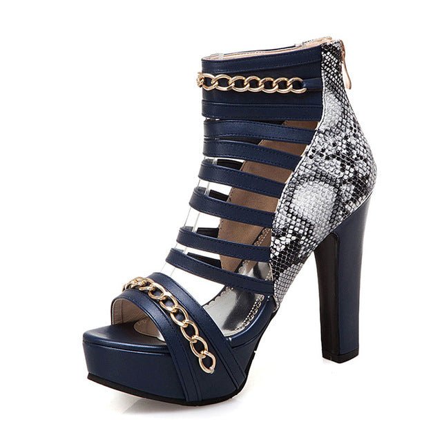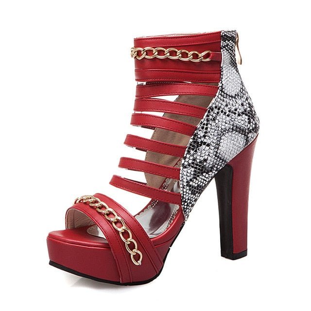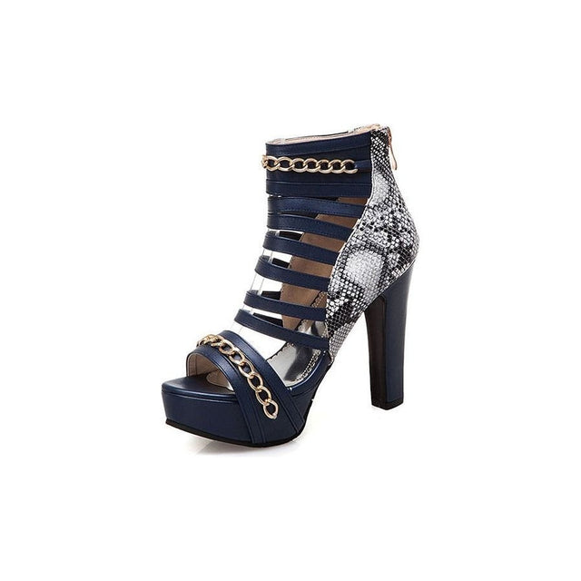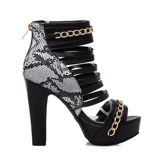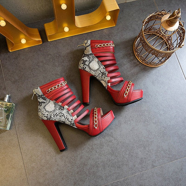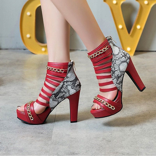 The Serpatura Glamour Slip Heels feature a solid PU construction with a super high square heel over 3.1 inches and a platform height between 1.2 to 2 inches. Designed in a gladiator sandal style, they include a convenient zip closure.