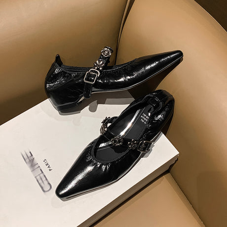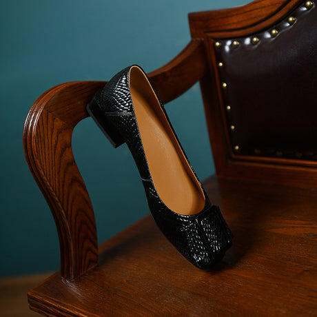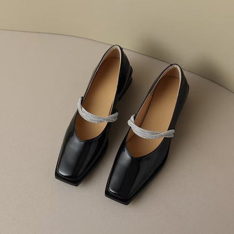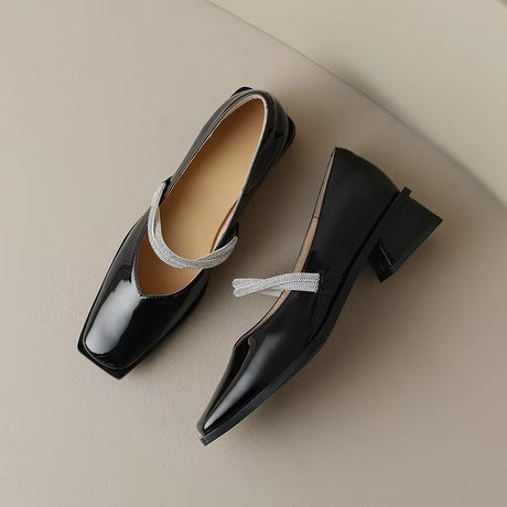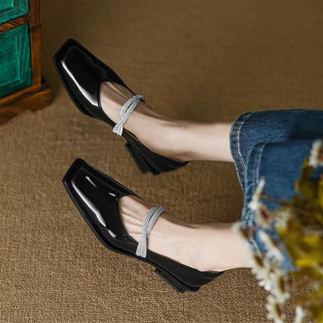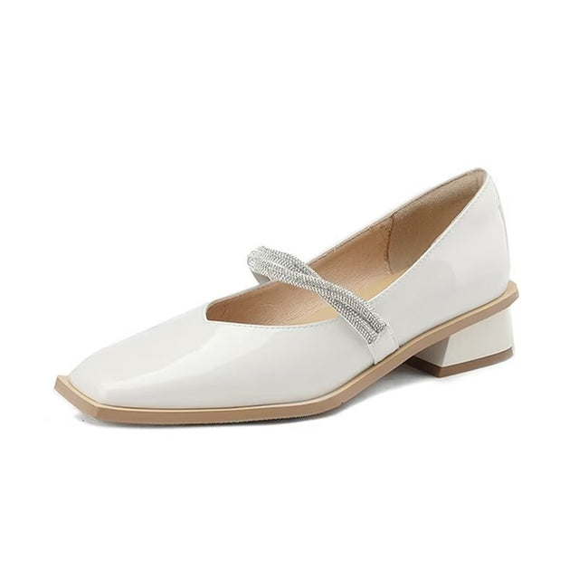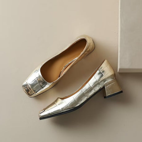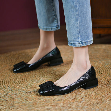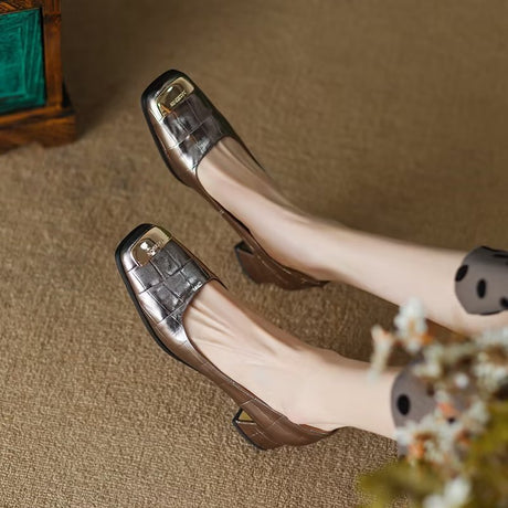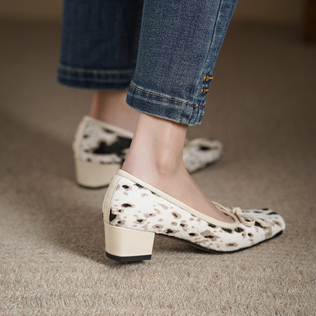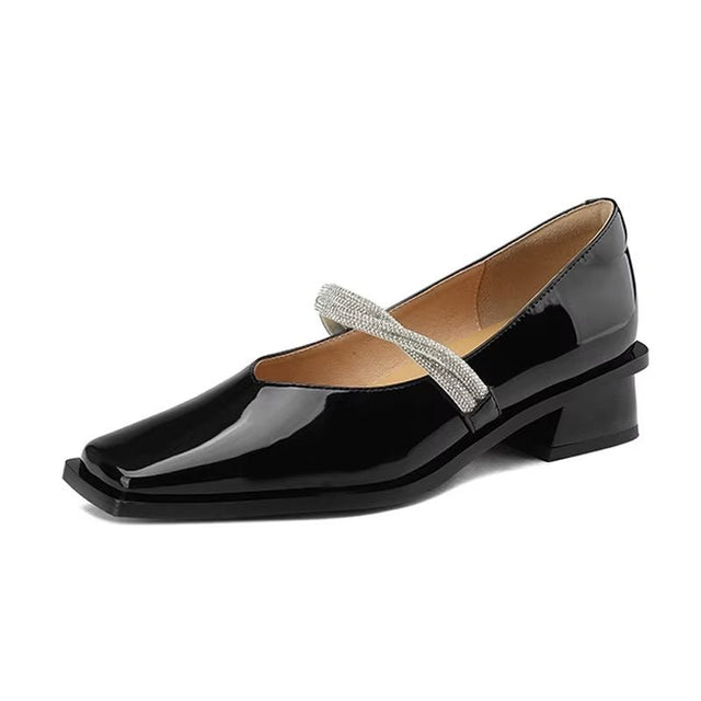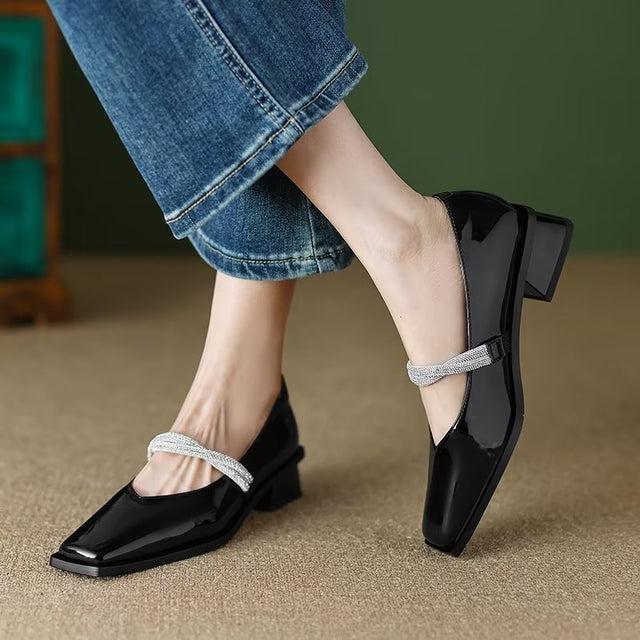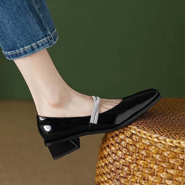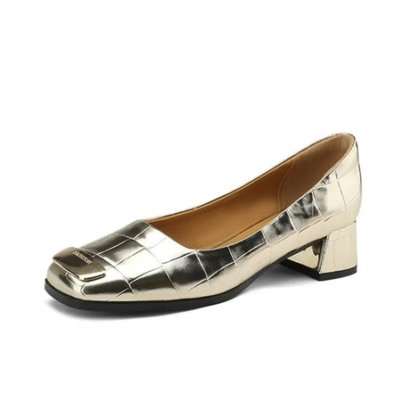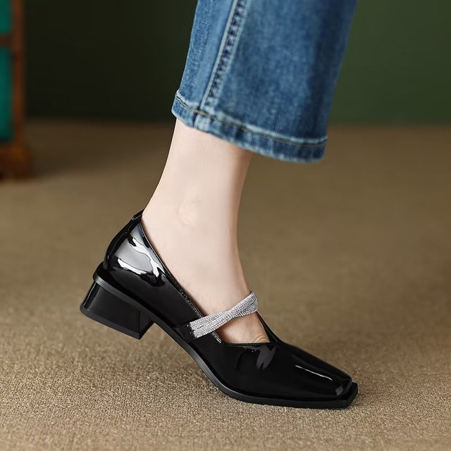 The Ebonique Elegant Event Heels feature a genuine leather construction with a sheepskin upper and insole, a square toe design, and a convenient slip-on closure, complemented by a 1.4-inch heel height.