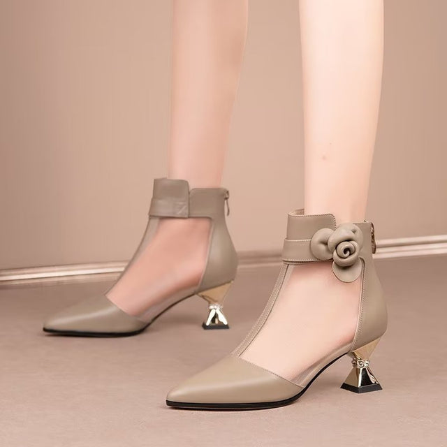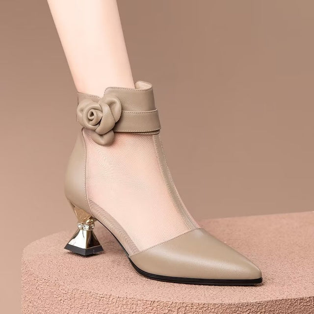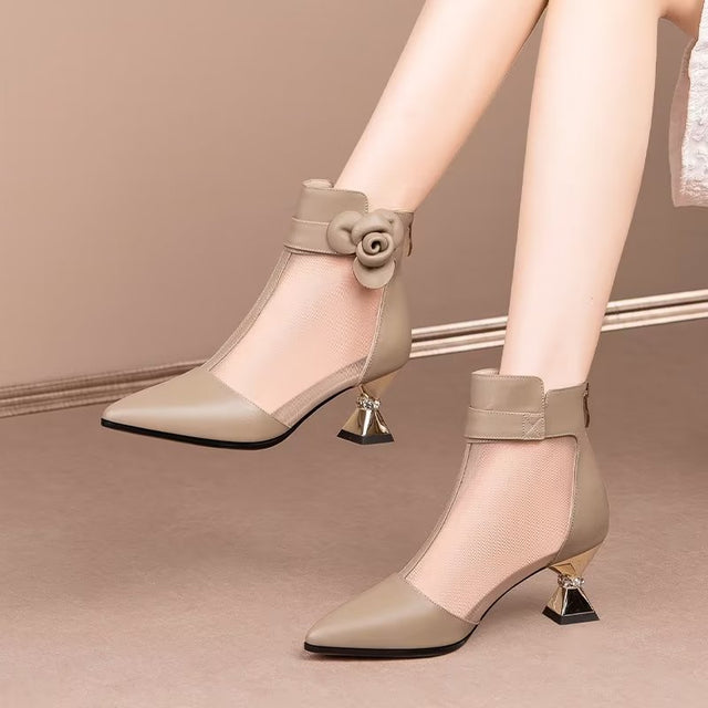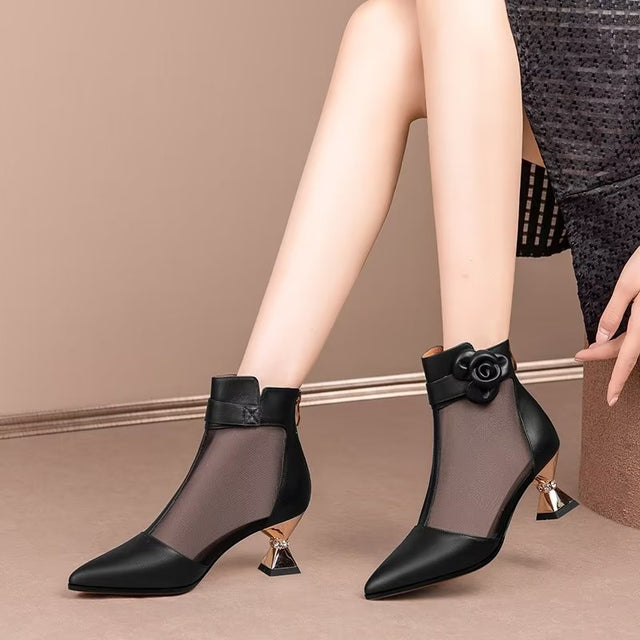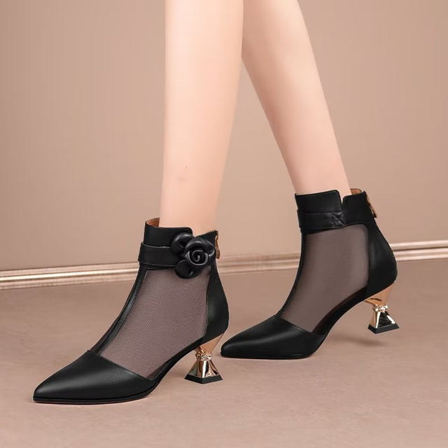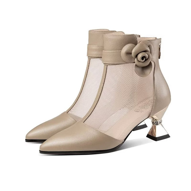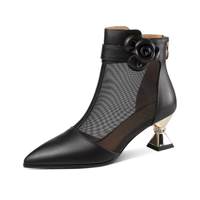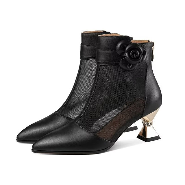 The Luxalon Fieralis Event Boots are ankle boots crafted from breathable air mesh with a pigskin lining, featuring a 2.36-inch thick heel and a pointed toe design, secured with a convenient back zipper closure.