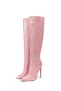 The Diamoré Luxalon Event Boots are knee-high tall boots crafted from PU with a plush lining, featuring a solid pattern and a back zip closure. They have a super high square heel over 4.7 inches, a pointed toe, and a rubber outsole