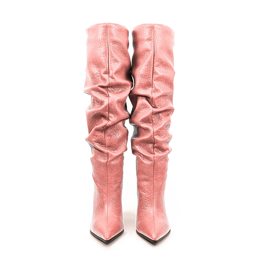 The Granderie Luxalon Prestige Knee Highs are tall winter boots crafted from solid leather, featuring a pointed toe design and a durable rubber outsole. They have a convenient Slip on closure for easy wear.